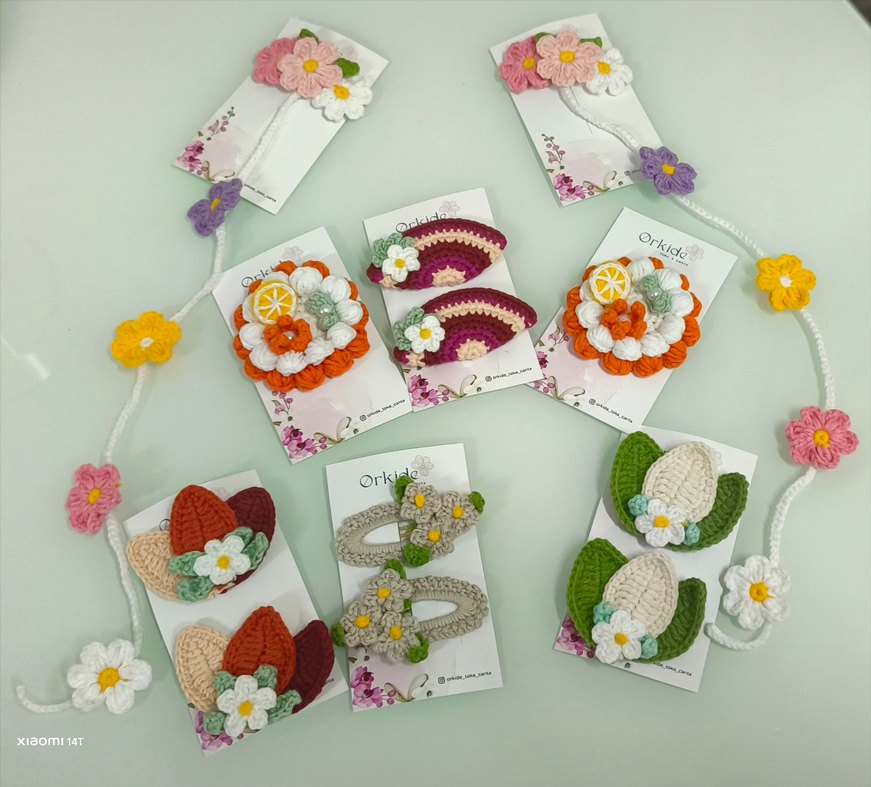 Nakışlı çiçek ve meyve detaylı renkli örgü çocuk tokaları, bohem tarz için uygun. çift 60₺ salkım çift 100₺