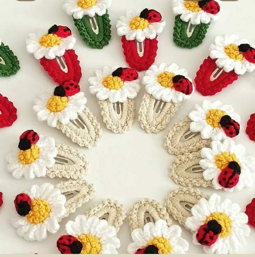 Renkli nakışlı çiçek ve uğur böceği detaylı örgü çocuk tokaları, bohem ve retro tarzda