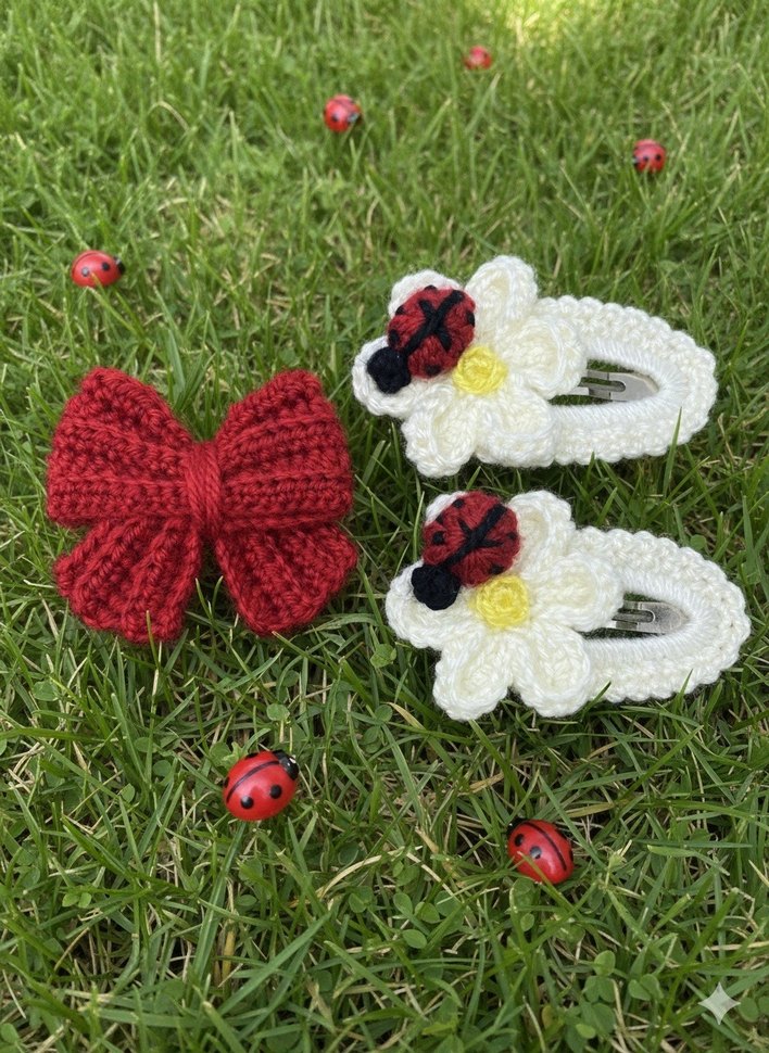 Nakışlı çiçek ve uğur böceği detaylı, renkli örgü çocuk tokaları seti, bohem tarzına uygundur.