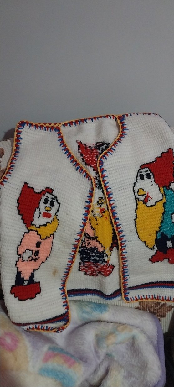 Renkli nakışlı palyaço desenleri ve çok renkli kenar süslemeleri bulunan yumuşak örgü çocuk yeleği.