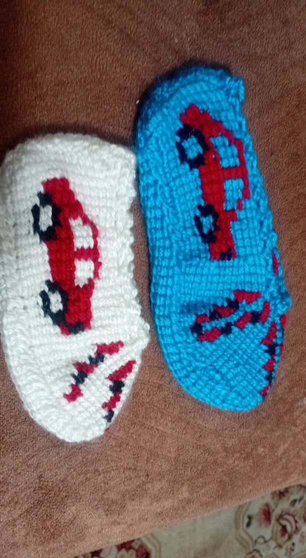 Renkli nakışlı araba desenlerine sahip, yumuşak örgü kumaştan yapılmış bohem ve retro tarzda erkek bebek patikleri. istenilen renkte ve modelde örülür