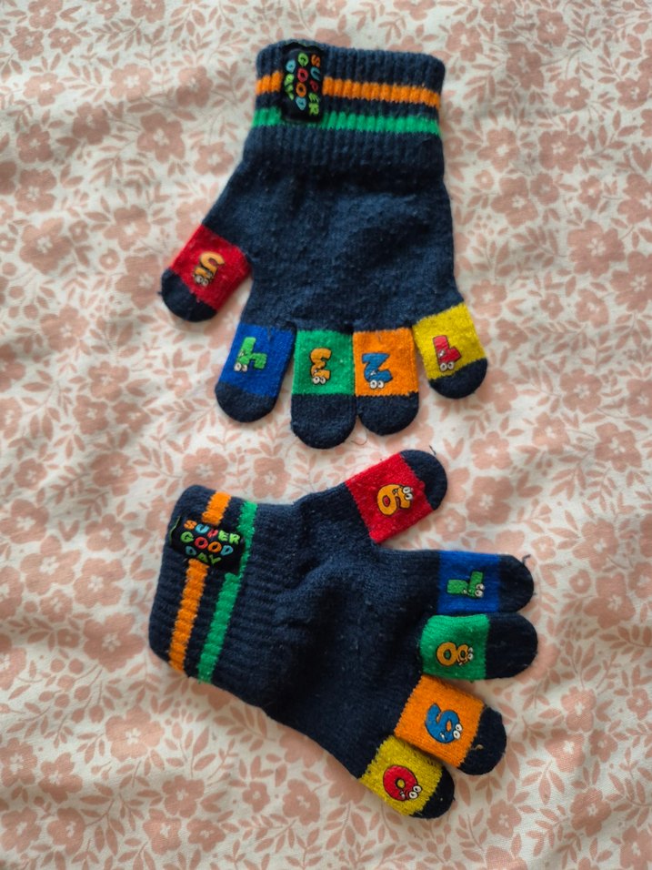 Renkli nakışlı sayılarla süslenmiş, örgü erkek çocuk eldivenleri, yumuşak ve rahat kumaşa sahiptir. Bohem tarz için uygun.