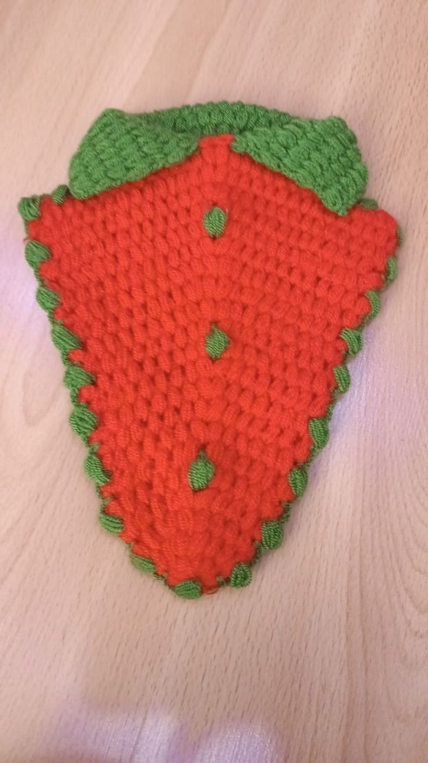 Canlı turuncu ve yeşil renklerde, çilek şeklinde el yapımı örgü ve nakışlı fırın eldiveni.