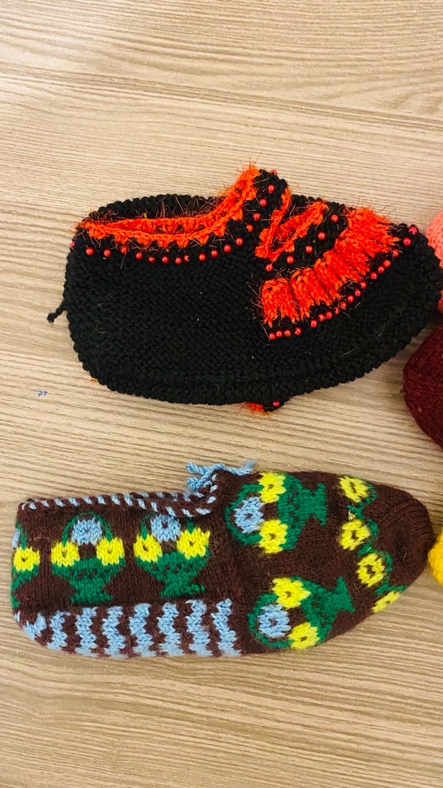 Renkli nakışlı desenlerle örgü kadın çetikleri. Sıcak ve bohem tarzıyla günlük kullanıma uygundur.