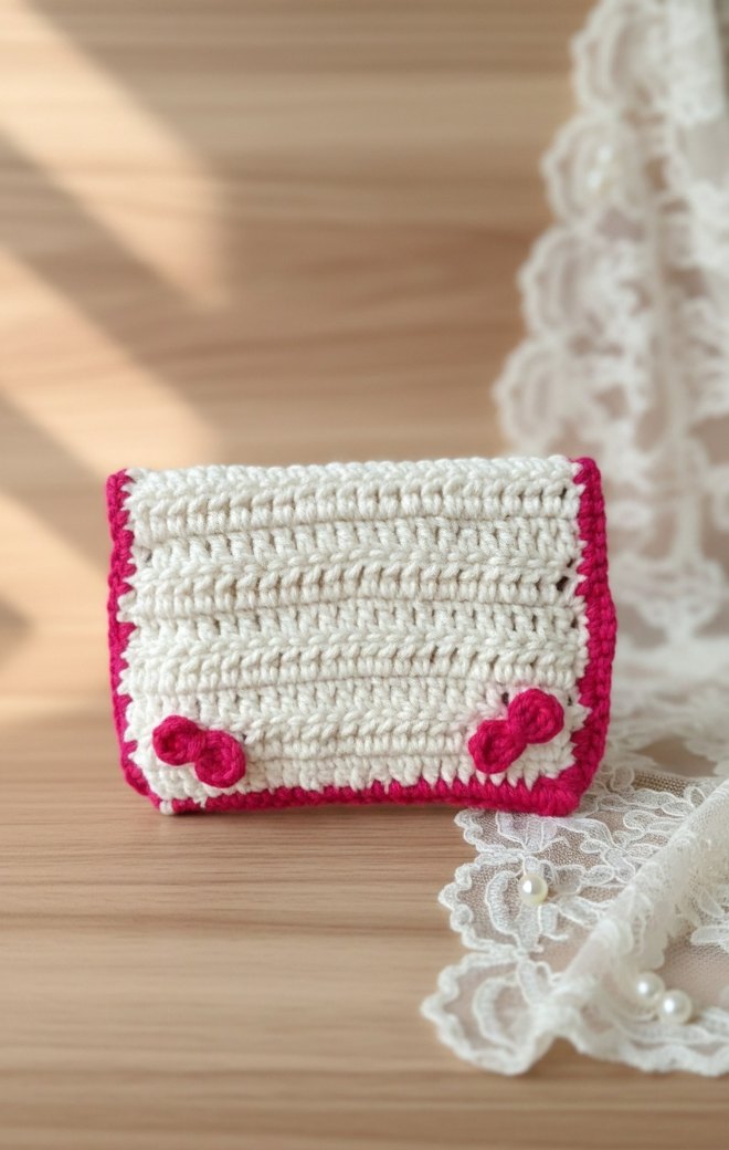 Örgü kumaştan, beyaz renkte ve renkli nakış detaylarına sahip kadın cüzdanı. Rahat ve bohem tarzı yansıtır, günlük kullanım için uygundur.