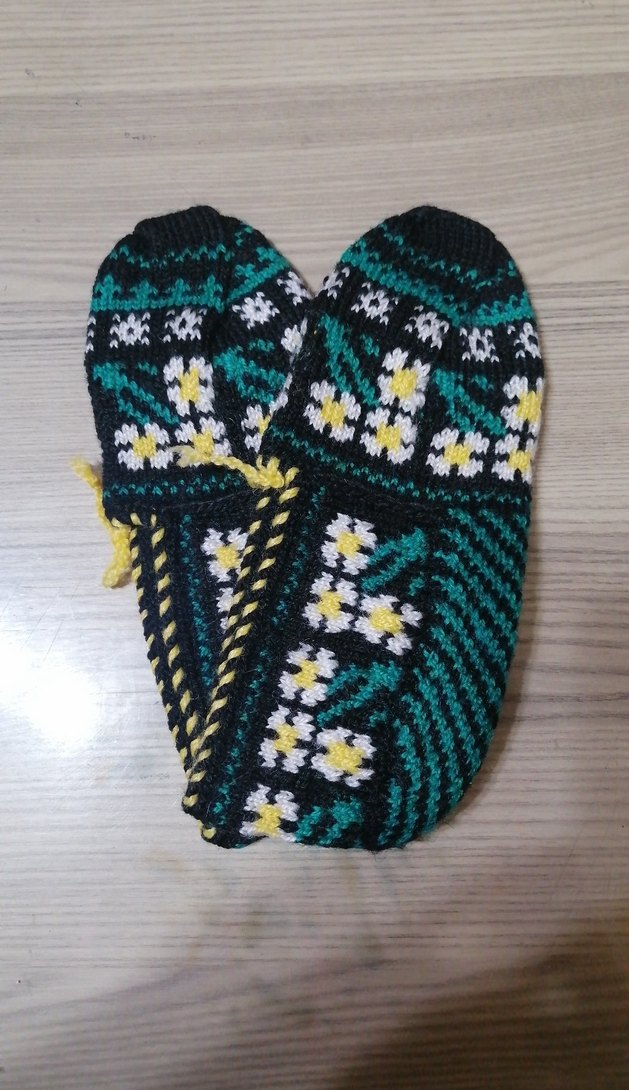 Renkli nakışlı örgü tasarıma sahip, bohem tarzda kadın ev terliği. Günlük kullanım için rahat ve özgün bir dokunuş sağlar.