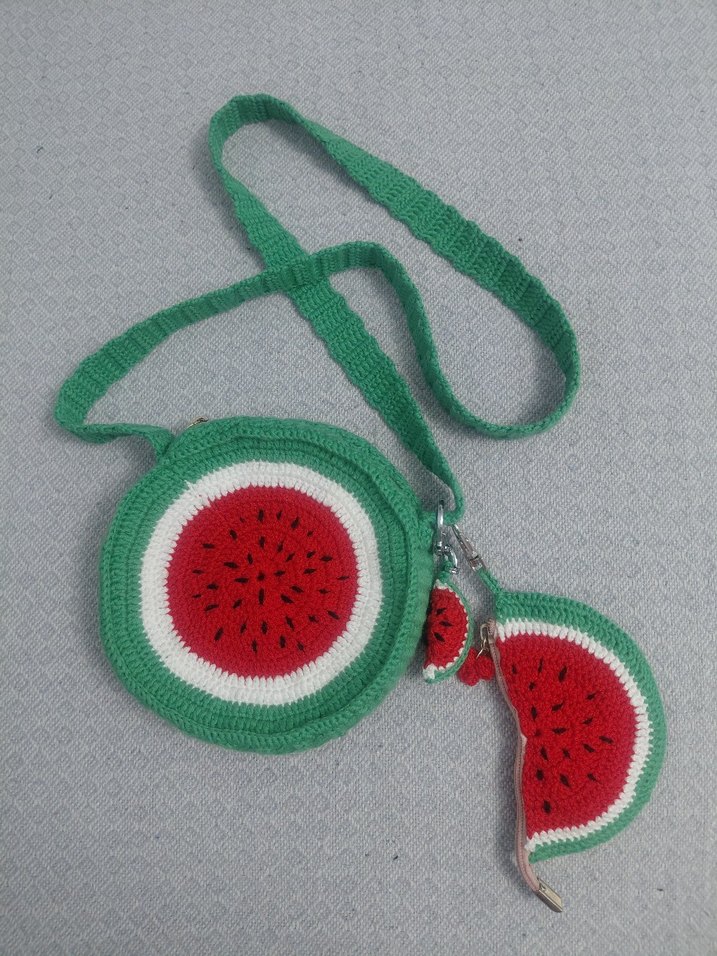 Renkli örgüden yapılmış, nakışlı karpuz desenli yuvarlak çanta ve uyumlu anahtarlık seti. Bohem tarz için uygun.
