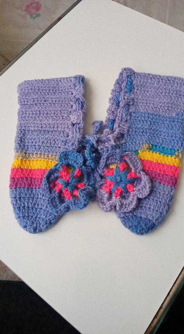 Renkli çizgiler ve nakışlı çiçek detaylarına sahip, yumuşak ve rahat örgü kız botları. Bohem tarzını yansıtır.