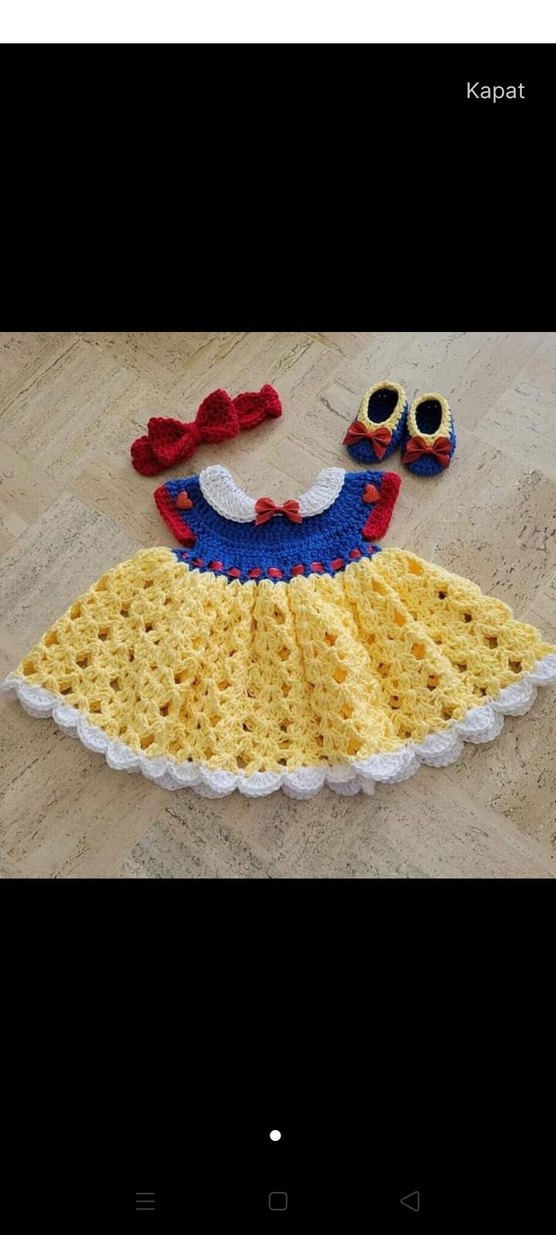 Nakışlı detaylara sahip renkli örgü kız elbisesi, bol kesim, tekne yaka ve askılı kollu. Bohem ve retro tarzında, uyumlu saç bandı ve ayakkabılarla.