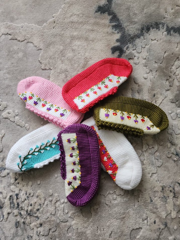 Çiçek nakışlı, renkli örgü kız ev terlikleri, bohem tarzı için uygun, konforlu ve geleneksel tasarıma sahiptir. 6 adet