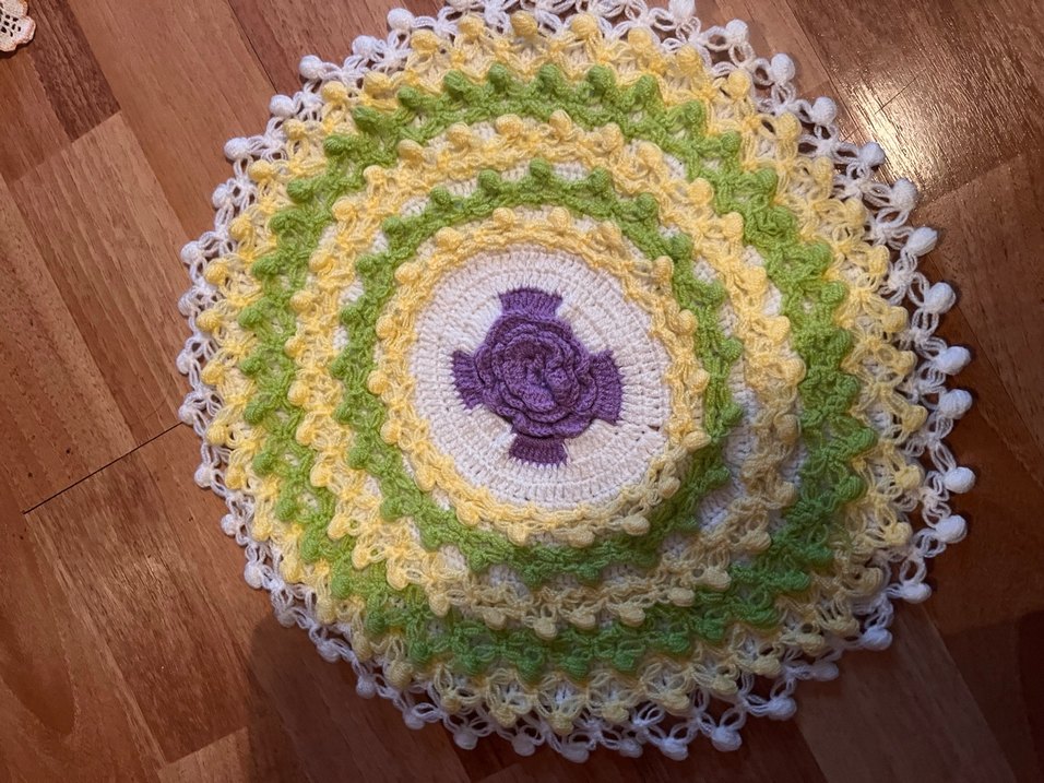 Renkli, sarı, yeşil, beyaz ve mor tonlarda yuvarlak nakışlı desenli örgü lif. Hem dekoratif hem rahat bir dokunuş sağlar.