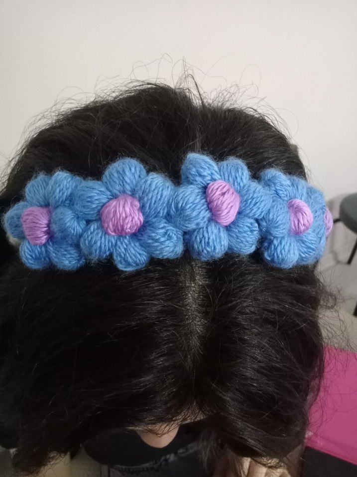 Örgü mavi saç bandı, renkli nakışlı çiçeklerle çocuk saçlarına bohem bir hava katıyor. sipariş üzerine istediğiniz renk yapılır