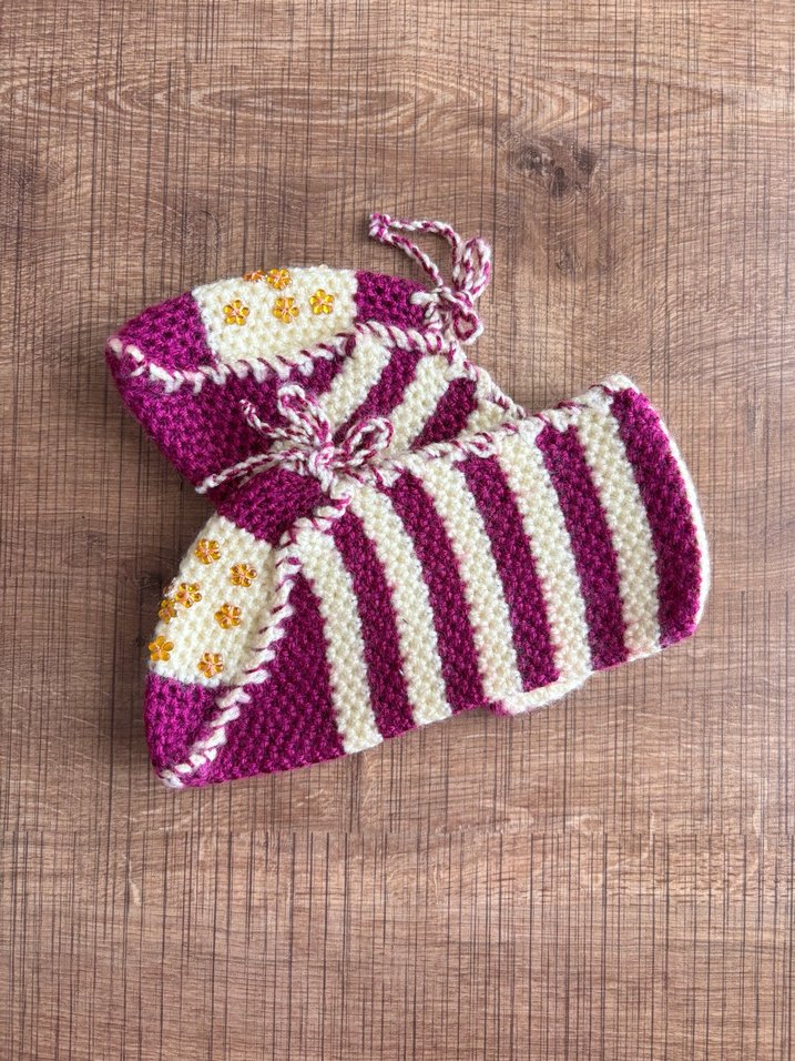 Renkli nakış detaylı, sıcak ve rahat örgü kız çocuk ev terliği. Bohem ve retro tarzda, klasik görünüme sahip.