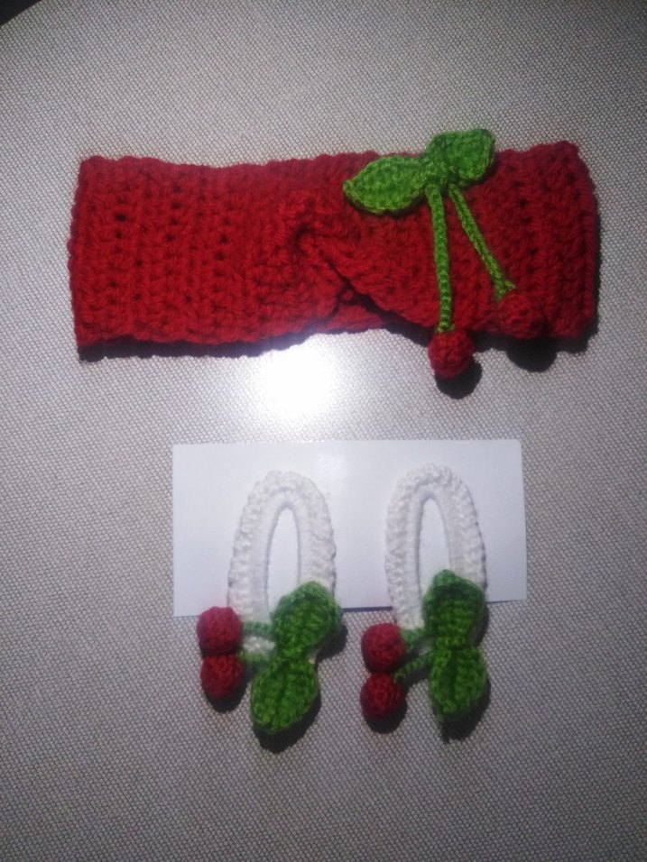 Kırmızı örgü saç bandı ve beyaz tokalar, renkli nakışlı kiraz ve yeşil yaprak süslemeli set.