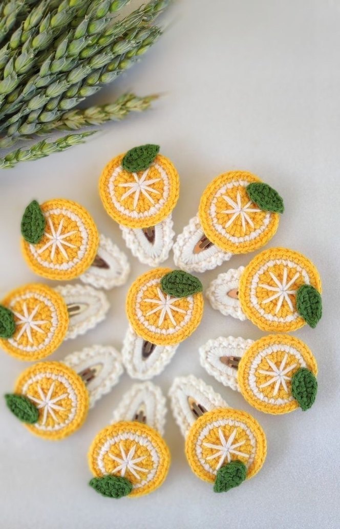 Renkli nakışlı örgü turuncu dilim ve yeşil yaprak detaylı çocuk saç tokası, bohem tarz için uygun. Adet fiyatıdır