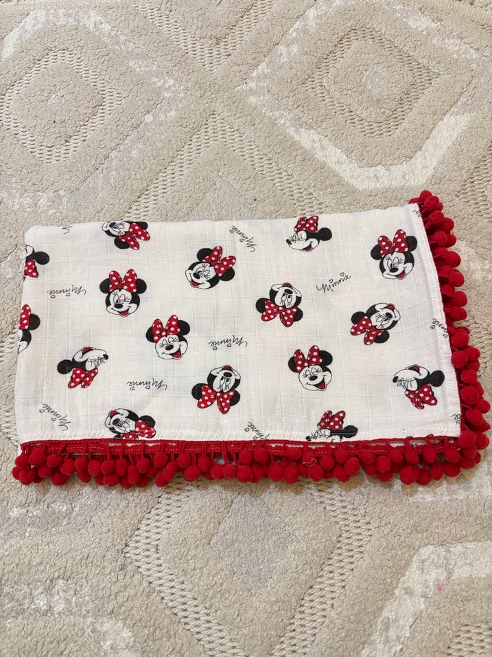 Yumuşak pamuklu kumaş üzerine nakışlı Minnie Mouse desenleri olan renkli çocuk battaniyesi, kırmızı ponponlu kenarlarla süslenmiştir. Bir defa kullanıldı