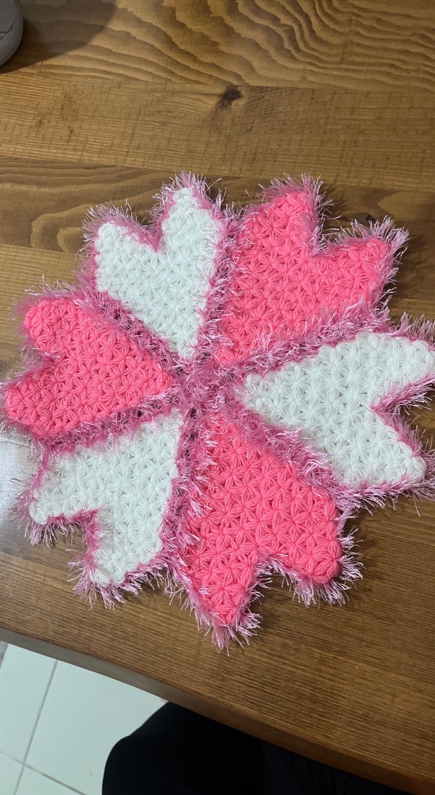 Renkli nakışlı kalp desenleriyle pembe ve beyaz tonlarda örülmüş lif