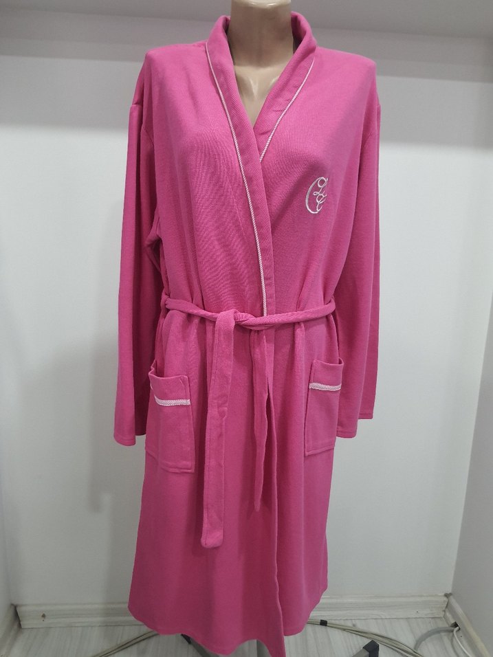 #sabahlık bol kesim pembe kadın sabahlık, renkli nakış detayları ve ceplerle rahat bir kullanım sunar. Bel kuşağı ile kapanır. Bir kez kullanıldı. Yeni gibi. koltukaltı en 56 cm. omuz ortadan boy 100 cm.