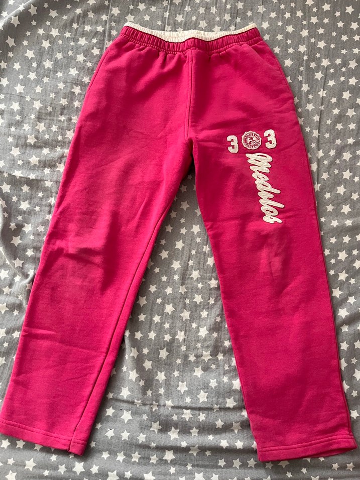 Rahat kesim, yumuşak ve sıcak kumaştan pembe kız eşofman altı, renkli nakış detaylı ve fermuarlı özellikli.