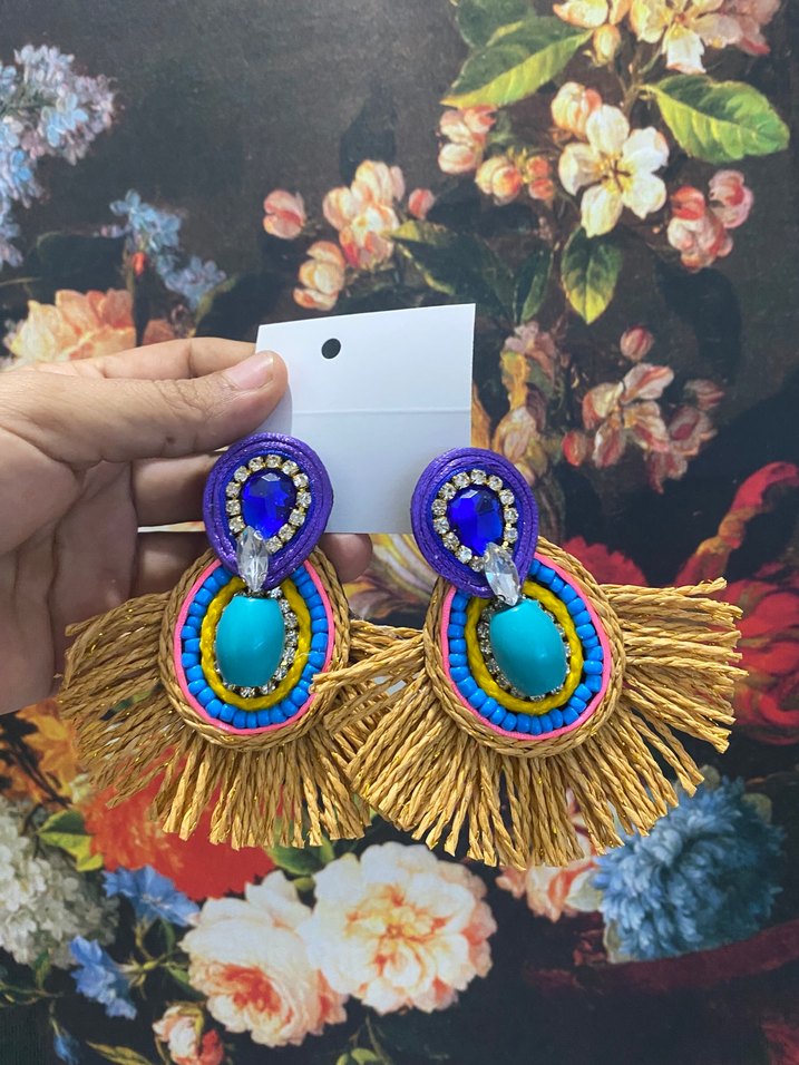 Nakışlı detaylara ve kısa püsküllere sahip renkli bohem küpeler, parti kombinlerine canlılık katmak için ideal. ✨ #küpe #takı #bohem #kadın #aksesuar