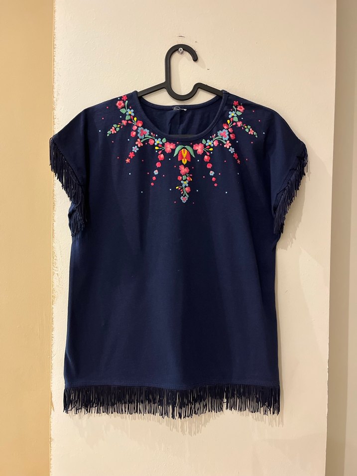 Yuvarlak yaka, kısa kollu, renkli nakış detaylı, bol kesim ve kısa boyda mavi bohem stile sahip kız çocuk tişörtüdür. Kollarda ve etek ucunda püskül detayları bulunur. 12-13 yaş bedendir