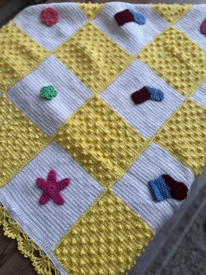 Renkli nakışlı desenlere sahip, yumuşak dokulu sarı örgü çocuk battaniyesi. Sıcacık tutar.