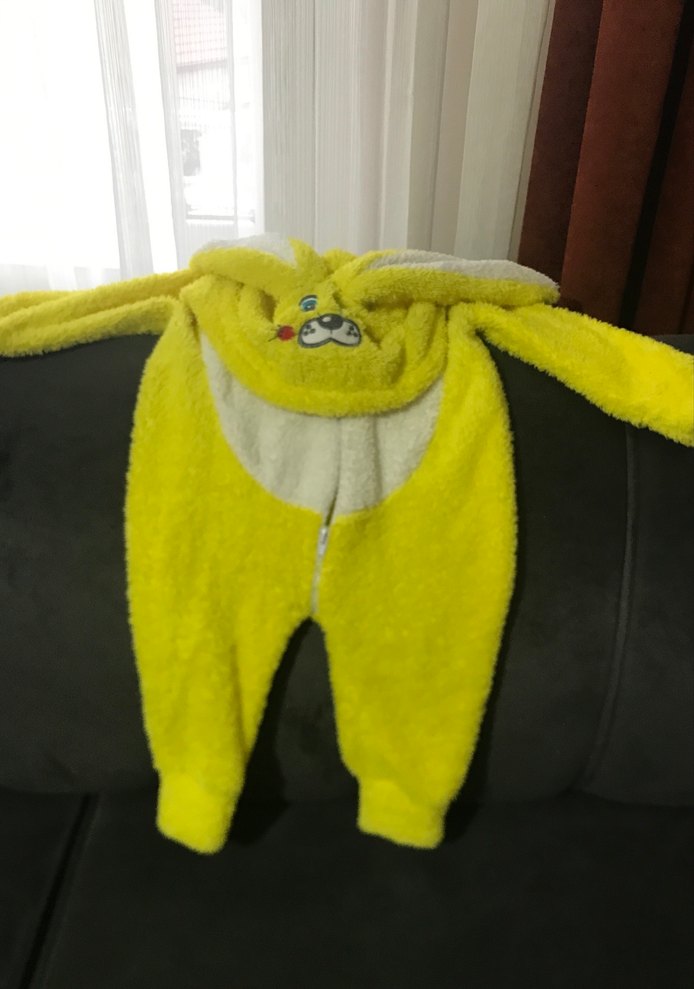 Renkli nakışlı detaylara sahip, örgü dokulu sarı köpek desenli tulum, streetwear tarzında tasarlanmıştır.