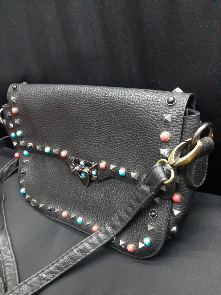 Siyah deri çanta, renkli nakışlı ve tokalı detaylarla rock punk ve grunge punk tarzını yansıtır, günlük kullanıma uygundur. orjinal valentino çanta.