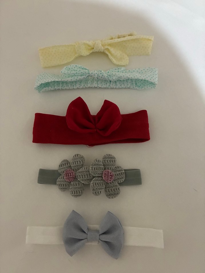 Nakışlı desenler ve kurdele detaylarına sahip renkli bohem tarzda çocuk saç bantları seti. Farklı renk ve tasarımlar, fiyonk ve çiçek nakışı içerir. Kırmızı ve gri tokalı hiç kullanılmamıştır,diğerleri 1 kere kullanıldı