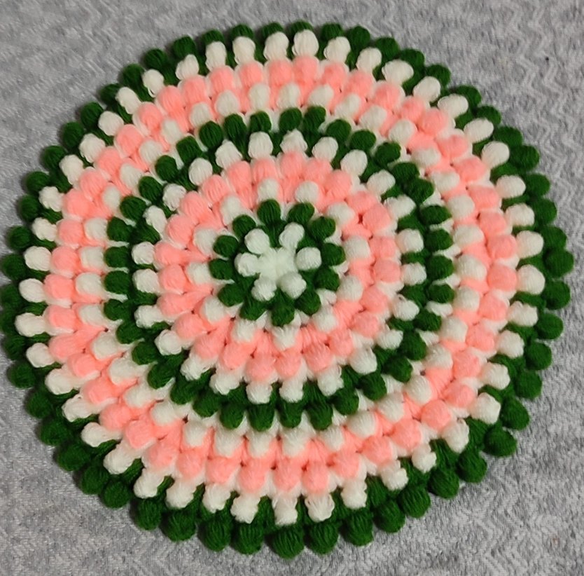 Yeşil, pembe ve beyaz renklerde nakışlı desenlere sahip renkli yuvarlak banyo paspası.