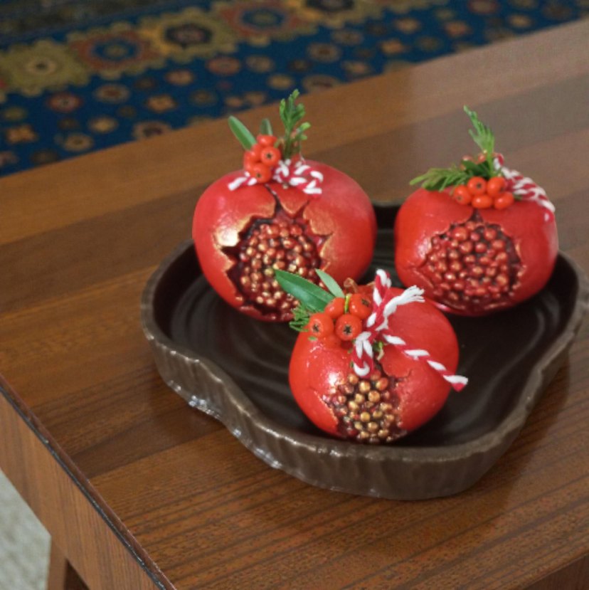 Küçük meyve ve yaprak süslemeleriyle renkli kırmızı nar figürleri, koyu renk bir tepsi üzerinde sergileniyor.