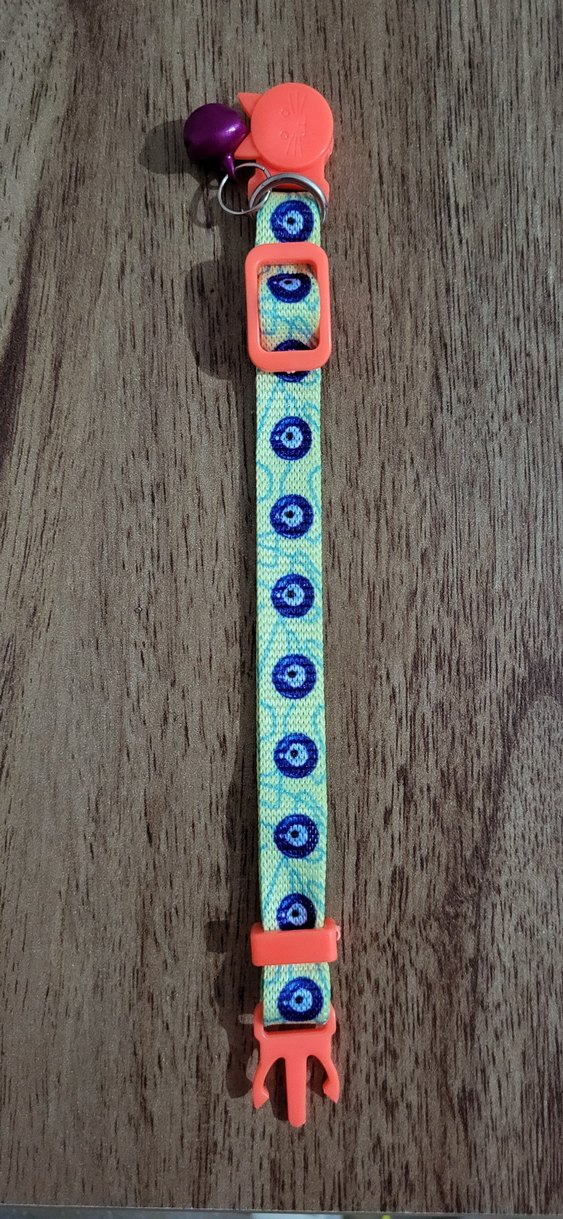 Ayarlanabilir turuncu tokalarıyla turkuaz renkte evcil hayvan kedi ve küçük ırk köpek tasması. Güvenlik kilitli. Hediye geldi hiç kullanılmadı