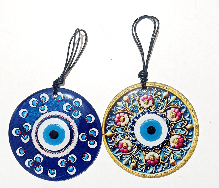 Çiçekli ve geleneksel desenlere sahip renkli nazar boncuğu duvar süsü, kolay asılabilen iplerle birlikte 2'li set olarak sunulur.