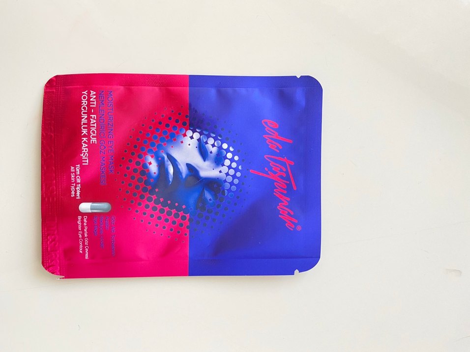 Canlı mavi ve pembe ambalajda, göz çevresine nem ve bakım sağlayan renkli göz maskesi tozu.