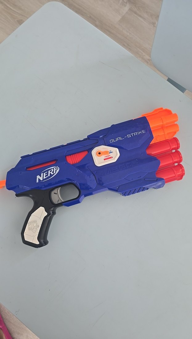 Mavi gövdesi ve canlı turuncu ile kırmızı namluları olan renkli Nerf Dual-Strike oyuncak tabanca. Detaylı tutma yeri ve tetik içerir.