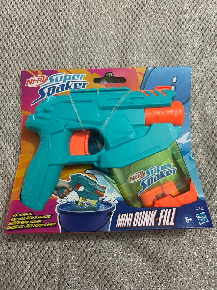 Mavi gövde ve turuncu tetikli renkli Nerf Süper Soaker oyuncak tabanca. Hızlı doldurma için mini dunk-fill su haznesi bulunur. 6 yaş ve üzeri için uygundur.