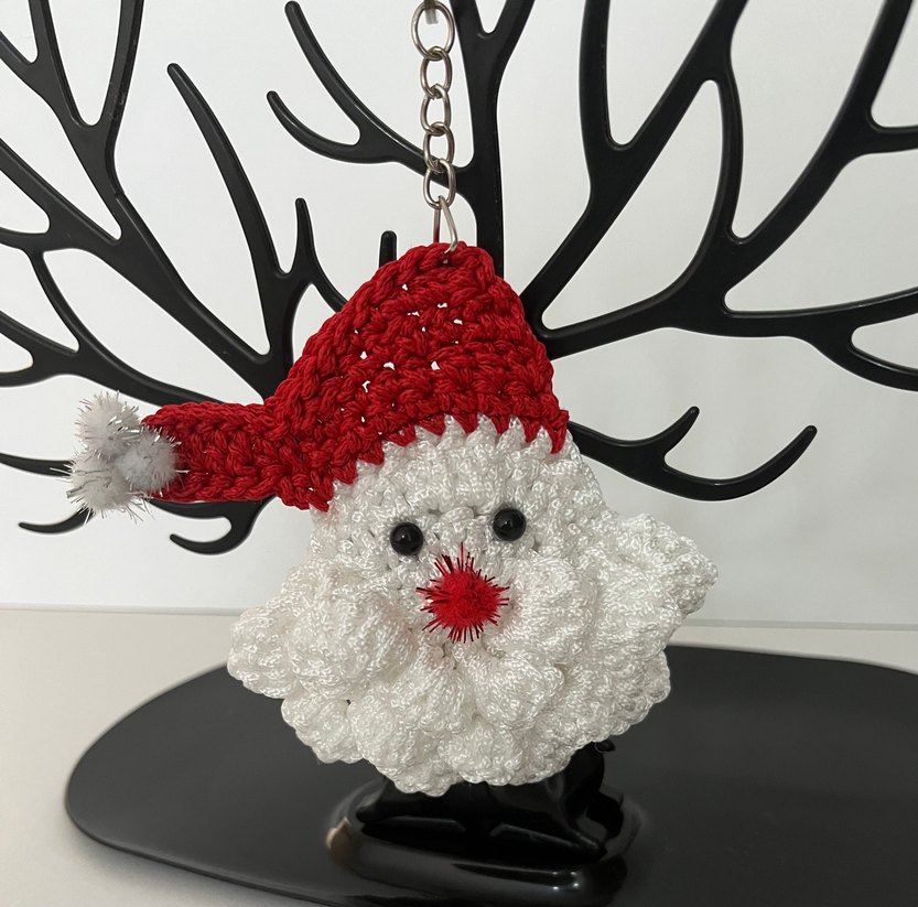 Renkli Noel Baba anahtarlık, beyaz tığ işi yüzü, siyah boncuk gözleri ve kırmızı burnu ile kırmızı şapkalı.