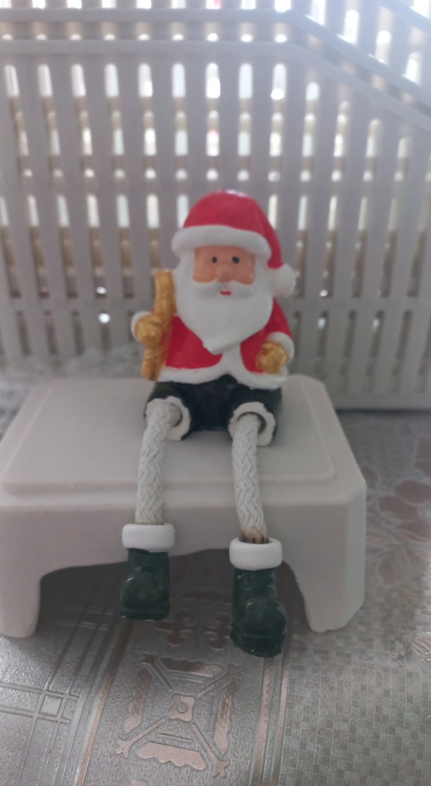Bu renkli Noel Baba biblosu beyaz sakal, kırmızı şapka ve ceket, siyah botlar ve örgü ipten esnek bacaklara sahiptir.