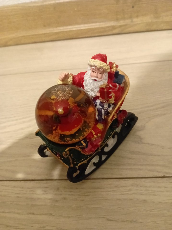 Renkli Noel Baba biblosu, kızak üzerinde oturuyor ve dekoratif bir küre tutuyor. Kızak altın ve kırmızı detaylarla süslenmiş. alt ksmnda az bi çizikler var şapkasının ucu küçücük kırıldı belli olmayacak şekilde fotolarda var