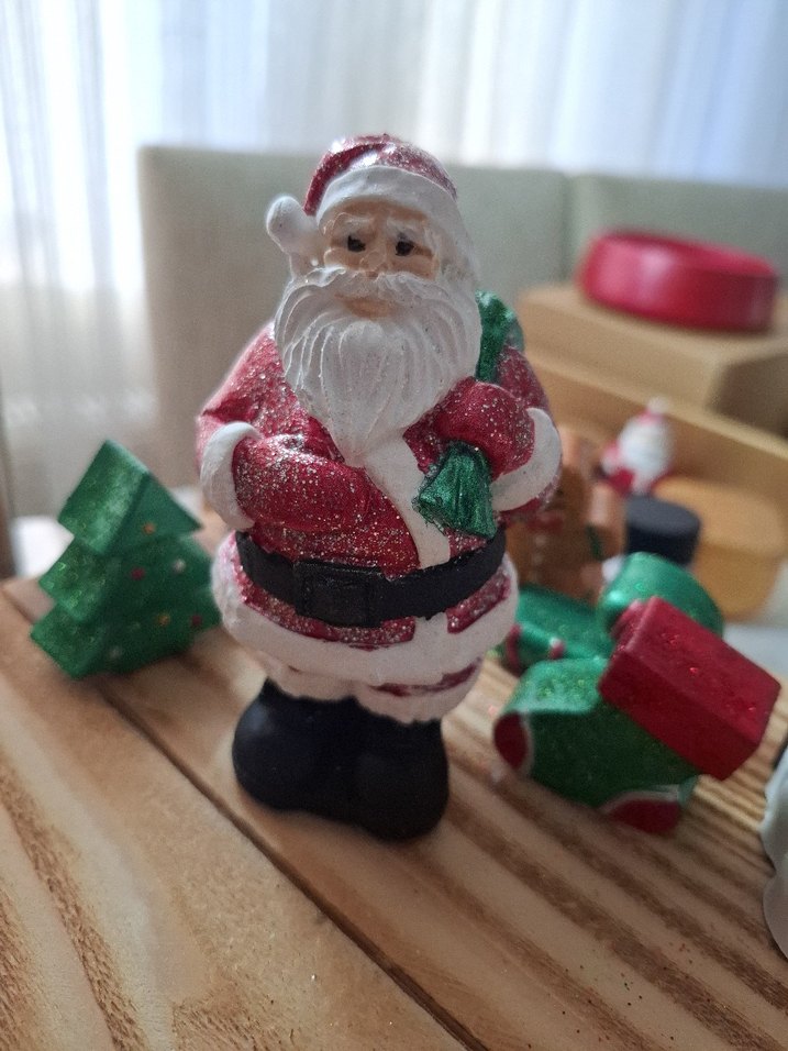Bu renkli Noel Baba biblosu, klasik kırmızı beyaz kıyafet, siyah çizmeler ve yeşil çanta ile süslenmiştir. Mekâna şenlikli bir hava katar.