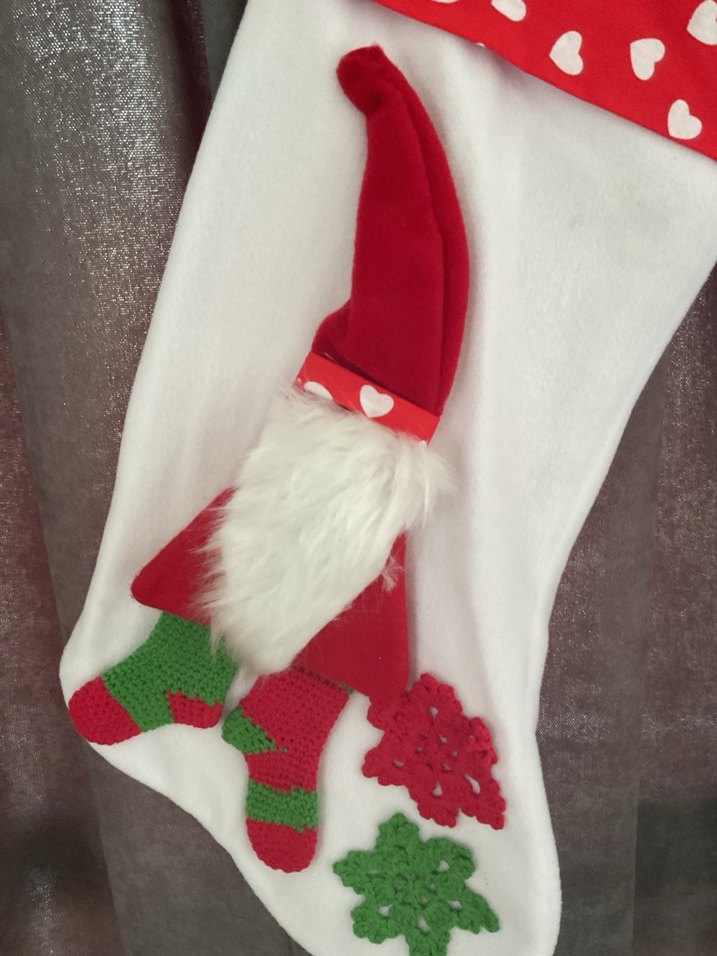 Kırmızı yılbaşı çorabında beyaz sakallı, yeşil-kırmızı çizgili çoraplı renkli Noel Baba figürü ve yeşil-kırmızı kar taneleri bulunur.