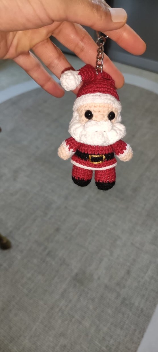 Kırmızı, beyaz ve siyah ayrıntılı tığ işi ile yapılmış renkli Noel Baba peluş anahtarlık . Toplu sipariş alınır