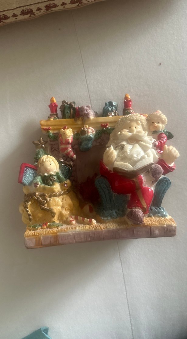 Bu renkli figürde Noel Baba, süslenmiş şöminenin yanında iki çocukla kitap okuyor, çoraplar ve mumlar gibi detaylar bulunuyor.