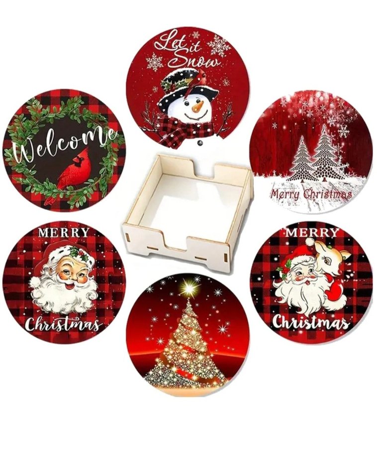 Renkli Noel temalı bardak altlıkları, kar adam, Noel Baba, yılbaşı ağacı ve kutlama yazıları içerir. Ahşap tutuculu.