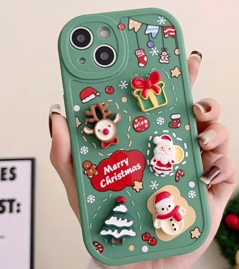 Noel temalı, 3D boncuklu figürler içeren renkli telefon kılıfı.