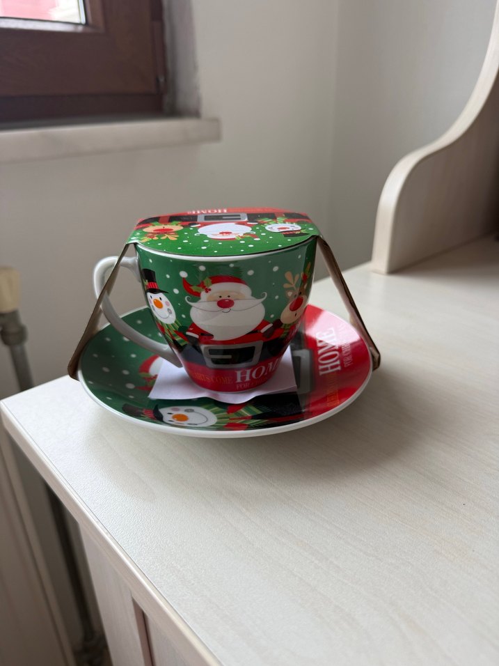 Yeşil ve kırmızı renklerde, figürlü ve Noel Baba kemerli porselen Noel fincan ve tabak seti. Ürünün kapasitesi 220 ml ve tabak çapı 15 cm’dir. Çap X Yükseklik: 8,5 X 8 cm. Ürün yurt dışından alınmıştır, hiç kullanılmamıştır.