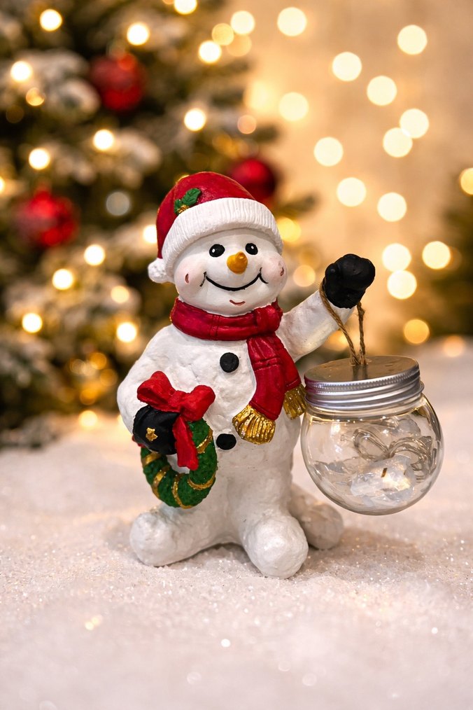Kardan adam biblosu, kırmızı atkı ve şapka takıyor, elinde çelenk ve cam fener taşıyor.