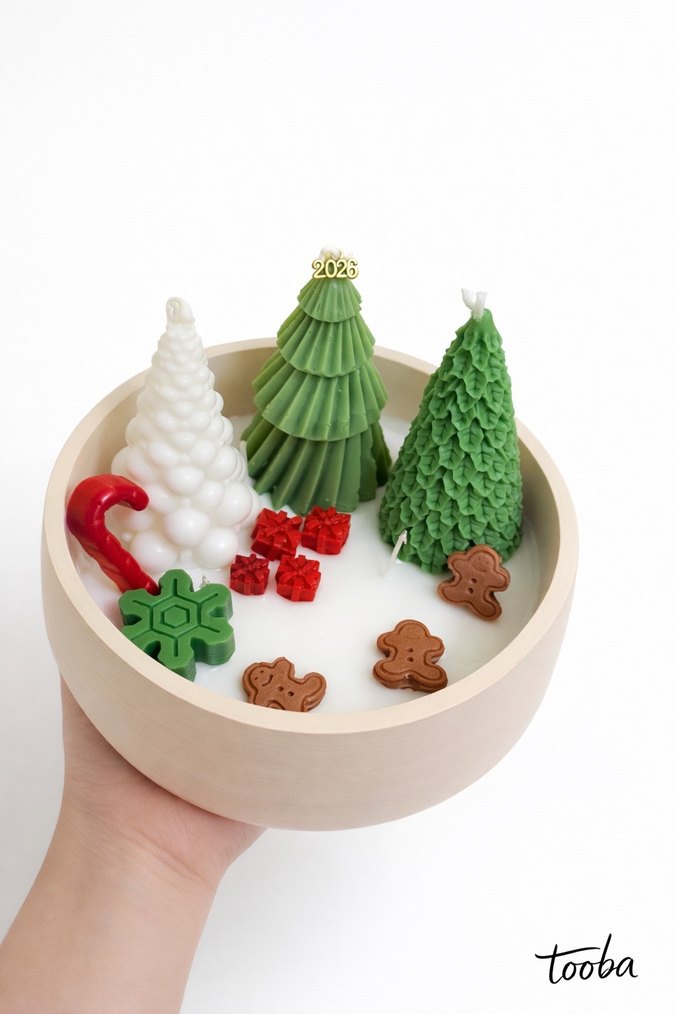 Renkli Noel temalı ağaç, zencefilli kurabiye ve süs mumları bulunur. Ürünlerin tamamı el yapımıdır