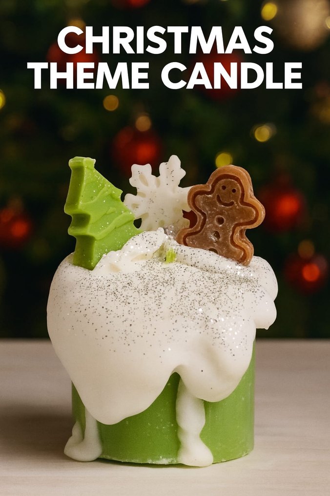 A&S Concept %100 soya wax Renkli Noel temalı mum, beyaz erimiş kar görünümünde üst kısmı ve yeşil ağaç, beyaz kar tanesi, kahverengi zencefilli adam figürleri ile süslenmiştir.