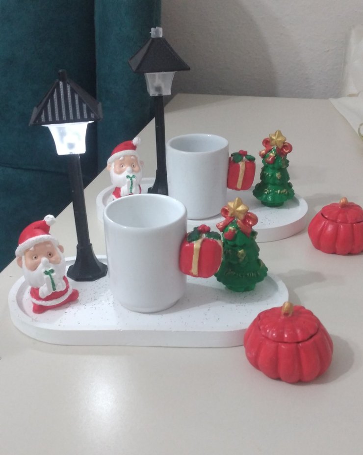 Beyaz mumluklar, minyatür Noel Baba figürleri, hediye kutuları, çam ağaçları ve sokak lambalarından oluşan renkli Noel temalı mumluk seti .